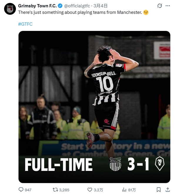 比赛结束后,格林斯比官方晒出比分图,并且配文:“和来自曼彻斯特的球队踢比赛真的有点说法的。😏”