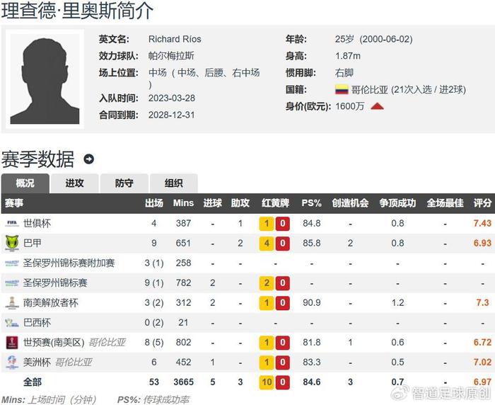 现年25岁的里奥斯,身高1.87米,右脚球员,能踢中场、后腰和右中场,德转身价1600万欧元,与帕尔梅拉斯的合同至2028年。里奥斯本赛季各项赛事共为帕尔梅拉斯出场34次,其中28次首发,合计出场2412分钟,贡献4球3助。